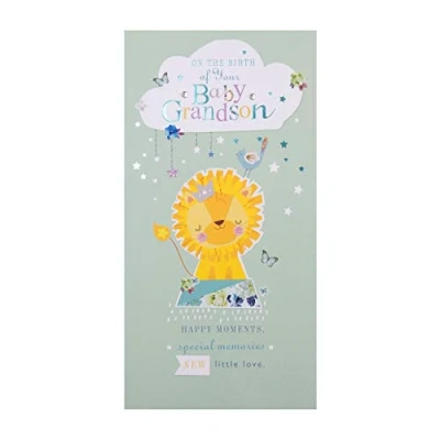 A new Grandson is most definitely something to celebrate so send your congratulations with this lovely card from Hallmark Printed on high quality board, made of material from well managed, FSC certified forests and other controlled sources. Features a cute lion design, heart shaped gem attachments, and Blue Foil lettering and design elements Comes complete with a co-ordinating pale blue Envelope Message reads: front: on the birth of your baby Grandson magical moments, special memories, new little love. Inside: you must be so delighted! Congratulations Measures: 22.8 cm by 12.1 cm, within Standard UK 'Letter' Size limits
