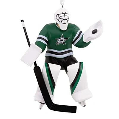 Fans of the Dallas Stars will proudly hang this stylized ice hockey player goalie Christmas ornament. Features signature green and silver uniform. Made of resin, this Stars Hallmark Ornament measures 3.125 x 3.75 x 1.625 inches. The ornament is ready to hang on your Christmas tree with a hanger attachment. Great Christmas gift idea for fans of the Dallas Stars and the National Hockey League. Hallmark Ornaments celebrate characters and personalities from contemporary and classic movies, TV shows, toys, entertainment and sports. Each festive and collectible ornament is perfect for sharing with family and friends. Each purchase includes one Christmas tree ornament packaged in a box.Unit count: 1.0.Batteries Required: False