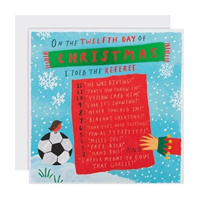 Win the Christmas season and put the gifts in the back of the net to celebrate, with this footy-tastic card from Hallmark This card is fully recyclable, and made of material from well-managed, FSC-certified forests and other controlled sources Printed on high-quality board, this card has a fun, 3D scarf attachment with festive, green foil; this card comes complete with a co-ordinating White, Hallmark Branded Envelope Message Inside Reads: Merry Christmas Measures: 16 cm by 16 cm; Within Standard UK 'Large Letter' Size Limits