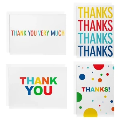 THANK YOU CARD: Brighten up their day and deliver a note of gratitude, with this Pack of 48 Thank You Cards. The perfect way to send a heartfelt note of appreciation with the relief of having a card ready and waiting. MUTLIPACK THANK YOU CARDS: Printed on high-quality board, this pack of 48 Thank You Cards contains 4 designs (12 of each design) with colourful lettering. Each card comes complete with a co-ordinating Hallmark branded, white envelope. FULLY RECYCLABLE AND HIGH QUALITY CARD: This product is fully recyclable, and made of material from well-managed, FSC-certified forests and other controlled sources. THANK YOU MESSAGE: With a thank you note on the front of each design, every card is blank inside for your own personal message and appreciation. From a really big thanks for attending your wedding to a small thanks for showing their support. SIZE: Every card measures H9.5cm by W13.2cm, and are the perfect size to store away, waiting and ready to send a Thank You message. Every card is accompanied with a Hallmark branded, white envelope. Within Standard UK 'Letter' Size Limits.