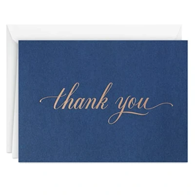Let your friends, family, and business connections know you appreciate them with this boxed set of classic thank you cards. Cards feature silver foil script "Thank you" lettering on a navy blue background. Cards are blank inside for your personalized message. Sophisticated thank you cards are a wonderful way to send a note of thanks after birthdays, everyday kindnesses, a job interview, or any special occasion. Pack includes 40 cards with coordinating envelopes. Notecards measure 3.75" x 5.2". Printed on high quality paper stock, Hallmark eco friendly stationery is made with paper from well-managed forests.