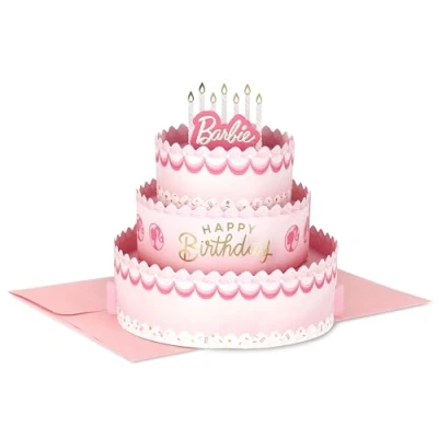 Wish Barbie fans of all ages a happy birthday with this fun pop-up birthday card. Barbie pop-up greeting card features a pink, 3-tier cake with gold "Happy Birthday" lettering and iconic Barbie logo and silhouettes. Back of card reads: "Celebrating you today!" with space to write a personalized message to your friend, sister, cousin, classmate or daughter. Pop-up card measures approximately 6.6" x 9.4" and comes with coordinating envelope; Crafted from high-quality paper materials, Hallmark's greeting cards are made with paper from responsibly managed forests Paper Wonder greeting cards are mini masterpieces featuring three-dimensional scenes made of layers of intricate laser-cut paper that create a moment of wonder and lasting celebration.