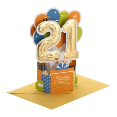 SPECIAL KEEPSAKE: Celebrate that special milestone and mark their 21st birthday in memorable style, with this eye-catching, Paper Wonder Collection, 3D Pop-Up 21st Birthday Card from Hallmark. NO ASSEMBLY REQUIRED: Printed on high quality board, with a simple, squeeze-to-pop-up mechanism, this vibrant card features a bold die-cut, 3D pop-up, green, orange and blue balloons design, with gold-foil 21 feature and lettering. SUSTAINABLE DESIGN: This card is fully recyclable, and made of material from well-managed, FSC-certified forests and other controlled sources. SIMPLE SENTIMENTS: Message On Back Reads: ...To You! SIZE & SENDING INFO: Card Measures: Flat: 17.1cm by 11.8cm, Within UK 'Large Letter' Postage Size Limits. Constructed: H16.4cm by W9.5cm by D5.8cm. Card comes complete with a Hallmark branded, yellow envelope.