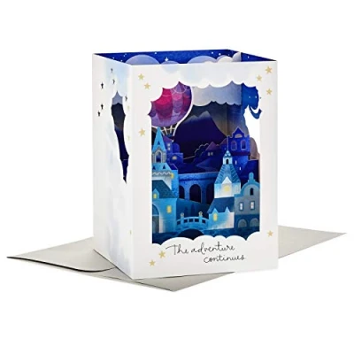 This elegant card unfolds into a beautiful anniversary surprise that can be kept as a keepsake and remembered year after year. Anniversary pop-up card unfolds into an impressive diorama showing a hot air balloon floating across the night sky above an intricate mountain village. Card includes the message: "The adventure continues. Here's to many more good times ahead. Happy anniversary." Personalize by writing your own message on the back. Anniversary card measures 6.6" x 9.4" and comes with a coordinating envelope. Printed on high quality paper stock, Hallmark's greeting cards are made with paper from well-managed forests. Paper Wonder greeting cards are mini masterpieces featuring three-dimensional scenes made of layers of intricate laser-cut paper that create a moment of wonder and lasting celebration.