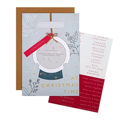 Add a thoughtful, personal touch to your Christmas wishes with this keepsake photo-frame attachment, with multi-recipient sticker sheet to perfectly customise captions card from Hallmark This card is fully recyclable, and made of material from well-managed, FSC-certified forests and other controlled sources Printed on high-quality with a unique customisable hanging bauble frame attachment, photo frame attachment with caption sticker sheet, silver foil lettering and details, and a brown twine hanging bow attachment; this card comes complete with a co-ordinating Brown Kraft, Hallmark Branded envelope Message Inside Reads: Merry Christmas Measures: 22.8 cm by 15.9 cm, within Standard UK 'Letter' Size limits