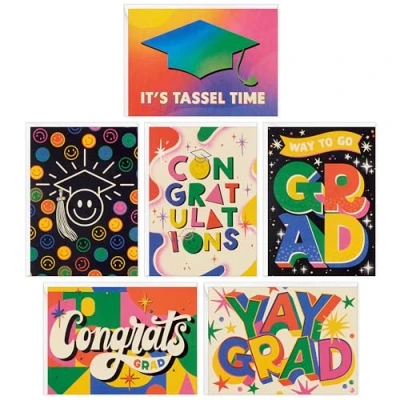 Cheer on the grads in your life with this set of colorful graduation cards Pack of 36 graduation cards includes 6 colorful designs with stars, smiley faces, mortarboards and cheerful lettering reading, "Congrats, Grad," "It's Tassel Time," "Yay, Grad," and more Cards are blank inside so you can write a personalize message to friends and loved ones. Buy in bulk to make it easy to congratulate grads from high school or college. Graduation cards measure approximately 4" x 5.5" and come with coordinating envelopes Printed on high quality paper stock, Hallmark's greeting cards are made with paper from responsibly managed forests.