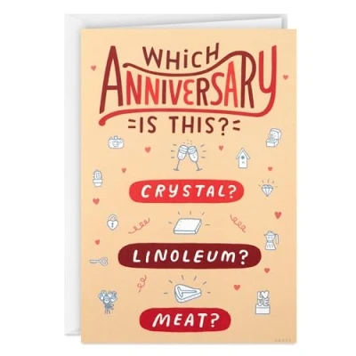 Make your favorite couple laugh on their anniversary with this funny card from Shoebox Cover features cute cartoons and red lettering that reads "Which anniversary is this? Bronze? Crystal? Linoleum?" Inside reads: "Whichever one it is, hope it's a happy one!" Perfect for married friends, adult children or grandchildren, or parents Funny greeting card measures approximately 5" x 7.2" and comes with coordinating envelope; Crafted from high-quality paper materials, Hallmark's greeting cards are made with paper from well-managed forests Shoebox greeting cards are the perfect way to make someone laugh out loud. These edgy, irreverent takes on life are surprising, hilarious, often inappropriate and always timely.