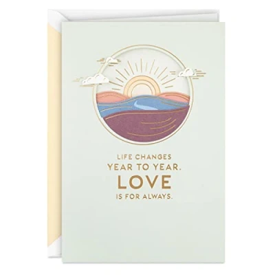 Wish your husband, wife, boyfriend, or girlfriend an extra special anniversary with a premium card that expresses just how you feel. Cover features a colorful design of the sun setting over the ocean, accented with gold foil. Message reads: "Life changes year to year. Love is for always." Inside reads: "Happy anniversary to the love of my life." Anniversary card measures 5" x 7.2" and comes with a coordinating envelope. Printed on high quality paper stock, Hallmark's greeting cards are made with paper from well-managed forests. Hallmark Signature offers stylish shoppers a curated and considered line of upscale and unique cards and gifts that reflect their personal style and make an immediate and lasting impression.