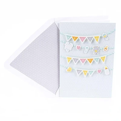 Wish the new parents well as they welcome their bundle of joy to the family. Cover features banners displaying the message "Hello, little one" and baby icons like a onesie, teddy bear, and bottle. Inside reads: "What a wonderful reason to celebrate. Congratulations." Baby card measures 5"x 7.2" and comes with a white envelope with a gray-and-white polka dotted liner Printed on high quality paper stock, Hallmark greeting cards are made with paper from well-managed forests. Signature offers stylish shoppers a curated and considered line of upscale and unique cards and gifts that reflect their personal style and make an immediate and lasting impression.