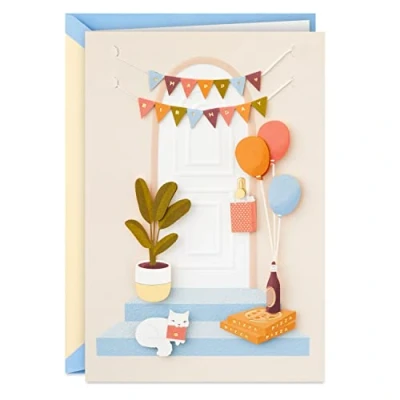 Wish your friend or family member a happy birthday with a celebratory birthday card they're sure to appreciate. Cover features an embellished design of a front stoop decorated with a "Happy birthday" banner, balloons, and birthday gifts, and a pizza with wine waiting on the step. Message reads: "Hope your birthday delivers everything you love." With a charming design and simple sentiment, this is the perfect way to celebrate your brother, sister, mom, dad, coworker, or anyone else on their birthday. Birthday card measures 5" x 7.2" and comes with a coordinating envelope. Printed on high quality paper stock, Hallmark's cards are made with paper from well-managed forests. Hallmark Signature offers stylish shoppers a curated and considered line of upscale and unique cards and gifts that reflect their personal style and make an immediate and lasting impression.