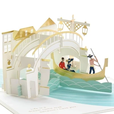 Surprise your spouse or significant other with a love note that's sure to brighten their day, whether it's your anniversary, Valentine's Day, or just a regular old Tuesday. Striped cover features a gold foil border and "I love you" lettering. Inside features an elaborate surprise pop-up of a couple passing under a bridge on a romantic gondola ride, and the message: "Life is a dream come true because I have you." With a special design and thoughtful sentiment, this card is a memorable way to celebrate a birthday, anniversary, Mother's Day, or Father's Day with your husband, wife, boyfriend, girlfriend, or romantic partner. Romantic pop up card measures 5" x 7.2" and comes with a coordinating envelope. Printed on high quality paper stock, Hallmark's eco-friendly cards are made with paper from well-managed forests. Hallmark Signature offers stylish shoppers a curated and considered line of upscale and unique cards and gifts that reflect their personal style and make an immediate and lasting impression.