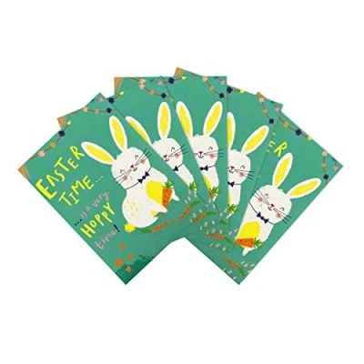 EASTER CARD PACK: With their fun design and cute message, this pack of 5 Easter cards from Hallmark will definitely spread a little extra Easter hoppiness. The perfect way to bring joy this Easter with heartfelt greetings and festive cheer. EASTER CARD MULTIPACK: Printed on high quality board, this pack of 5 cards features 1 Easter design with a white rabbit, wearing a bowtie, with carrots and the message 'Easter Time… Is a very Hoppy time!' on the front of the cards. FULLY RECYCLABLE & PREMIUM QUALITY CARD: This card is fully recyclable, and made of material from well-managed, FSC-certified forests and other controlled sources. EASTER WISH: Express your own Easter message and festive wish, each card includes the message 'Hope yours is really brilliant'. The perfect way to make their Easter extra special and full of sweetness and treats. SIZE: Each Easter card measures H13.2cm by W9.5cm, and is the perfect way to celebrate Springtime. The cards are accompanied with co-ordinating Hallmark branded, plain white envelopes. Within Standard UK 'Letter' Size Limits.