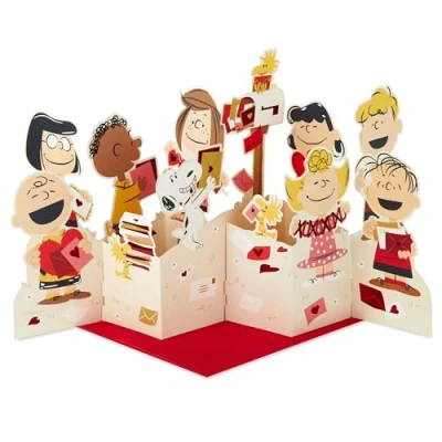 VALENTINES CARD: Send a love letter to your Valentines and make their day extra special, with this 3D and pop-up Valentine's Day card, from our PEANUTS collection. The perfect way to fill their heart with warmth and love. 3D VALENTINES CARD: This card pops-up into a 3D diorama of the PEANUTS Gang sharing love letters, with Charlie Brown, SNOOPY, WOODSTOCK, Lucy, Linus, Sally, Schroeder, Franklin, Peppermint Patty and Marcie. This card features metallic red foil details. HIGH QUALITY CONSTRUCTION & FULLY RECYCLABLE: This card is fully recyclable, and made of material from well-managed, FSC-certified forests and other controlled sources. LOVING MESSAGE: Write a special Valentines greetings to wish them a wonderful day and accompany it with our loving message, 'Hope your Valentine's Day is filled with nice surprises'. The perfect way to make sure their day is extra special. LARGE SIZE: The card measures H30.5cm by W21.9cm while flat and H31.1cm by W45cm by D14cm when assembled. This 3D Valentines Day Card is accompanied by a Hallmark branded, red envelope. Within UK 'Large Letter' Postage Size Limits.