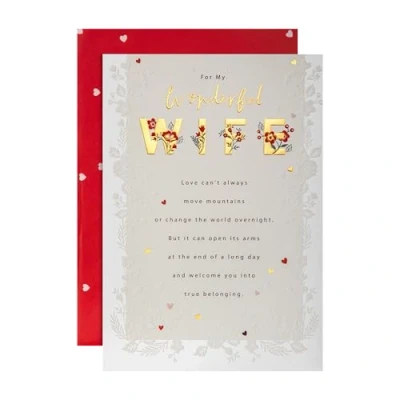 VALENTINES CARD FOR WIFE: Let your incredible wife know that she makes your world a better place, every day, with this beautiful, embossed Valentine's Day card. It's the perfect way to celebrate the love you share on February 14th! DESIGN: Embossed with foil highlights and message For My Wonderful Wife With All My Love on Valentine's Day. Love can't always move mountains or change the world overnight. But it can open its arms at the end of a long day and welcome you into true belonging. HIGH QUALITY CONSTRUCTION & FULLY RECYCLABLE: This card is fully recyclable, and made of material from well-managed, FSC-certified forests and other controlled sources. INSIDE: Your love is everything to me, it brightens all my days, And brings me so much happiness in countless special ways… Your love is everything to me, the best part of my life... I love you and I always feel so lucky you're my wife. Happy Valentine's Day SIZE & ENVELOPE: Card Measures: H22.8cm by W15.9cm, Within UK 'Letter' Postage Size Limits. The card comes complete with a co-ordinating deep red, heart-patterned, Hallmark branded envelope.