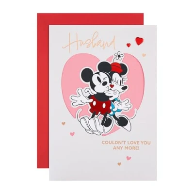 VALENTINES DAY CARD: Give your husband lots of hugs and kisses this Valentine's day, with this adorable Disney Minnie and Mickey Mouse Valentine's day card. VALENTINES CARD FOR HUSBAND: Printed on high-quality textured board, this card features Disney's iconic Mickey and Minnie Mouse, foil details, a die-cut heart shaped design, a paper insert, paper heart attachments, and a Hallmark branded, red envelope. HIGH QUALITY CONSTRUCTION & FULLY RECYCLABLE: This card is fully recyclable, and made of material from well-managed, FSC-certified forests and other controlled sources. SWEET MESSAGE: Husband couldn't love you any more! Happy Valentine's Day SIZE: Card Measures: 22.8cm by 15.9cm, within UK 'letter' postage size limits.