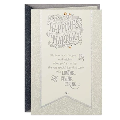 Send best wishes to a wonderful couple with a sweet congratulations card they're sure to appreciate. Cover features a traditional banner design, embellished with rhinestones and silver foil, and the message: "Wishing you happiness in your marriage. Life is so much happier and brighter when you're sharing the very special joys that come with loving . . . giving . . . caring." Inside reads: "May your future be happy day in and day out, the fulfillment of all that you're dreaming about, may your joys be unending, your plans all come true, and may life always hold all the best things for you. Congratulations." Wedding card measures 5.8" x 8.3" and comes with a coordinating envelope. Printed on high quality paper stock, Hallmark's greeting cards are made with paper from well-managed forests.