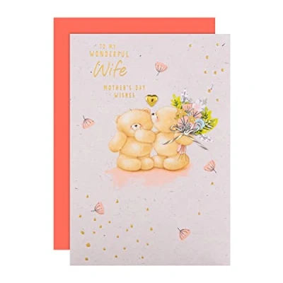 WIFE MOTHERS DAY CARD: Remind your amazing wife and the mother to your beautiful children... that she makes everyone's world complete, with this cute Mothers day card from Hallmark. The perfect way to thank her for all she does. CUTE MOTHERS DAY CARD: Printed on high-quality board, this card features Hallmark's Forever Friends bears exchanging a bouquet of flowers, embossed elements, a gold paper heart charm, a white and grey paper string bow attachment and gold foil details. HIGH QUALITY CONSTRUCTION & FULLY RECYCLABLE: This product is made using material from well-managed, FSC-certified forests and other controlled sources. LOVING MESSAGE: Send your own Mothers Day wish to accompany our loving message, 'You always do so much for our family... That's why you deserve to have the most relaxing mother's day! With lots of love x'. The perfect way to make their day extra special. SIZE: This Mothers day card measures H22.8cm by W15.9cm, and is the perfect size to wish lots of love. This card is accompanied with a co-ordinating Hallmark branded, pink envelope. Within Standard UK 'Large Letter' Size Limits.