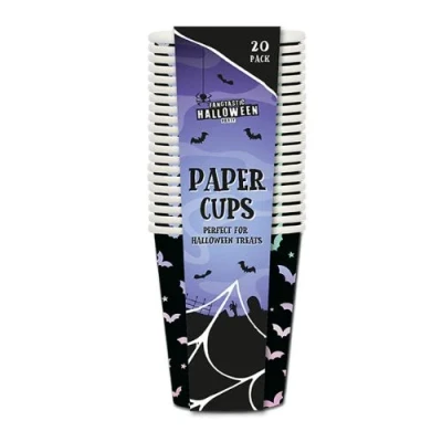 Elevate your Halloween party with our holographic paper cups! Each pack comes with 20 cups featuring a purple and black bat pattern. Made from durable 300GSM paper, they're perfect for spooky sips and easy clean-up. Impress your guests and save time with these disposable cups.. 1 x Halloween Holographic Paper Cups 20 Pack. H22.5 x W7.5 x D7.5cm. Product Dimensions: Per cup H11.3cm x Top DIA 7.5cm x Base DIA 5cm