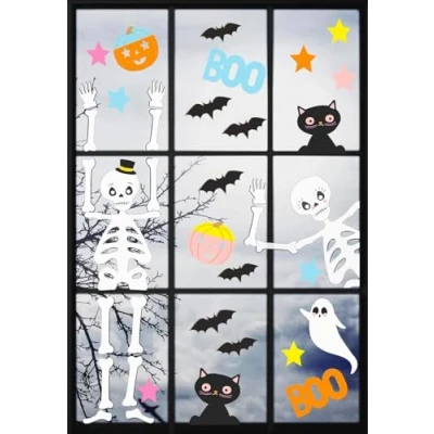 Halloween Reusable Window Stickers (NO Glue) Super Spooky Fun Party Decorations Kid Friendly Glass Clings, Featuring Bats, Skeletons, Black Cats, Pumpkins Made by Talking Tables UK 6 Sheets
