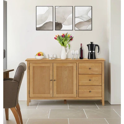 General description Crafted from solid rubberwood and real oak veneers, this sturdy framed sideboard offers versatile storage solutions. Featuring 3 drawers and a 2-door cupboard, it is ideal for storing crockery, pots and pans, or even clothing and beauty products. The sideboard can also be used in craft rooms or offices, providing ample space for organizing hobby supplies and paperwork. Perfect for smaller rooms, it creatively utilizes space in dining rooms, bedrooms, hallways, and kitchens. Technical specifications Material: Rubberwood, Oak Veneer, and MDF Finish: Lacquered Colour: Oak Height: 75 cm Width: 128 cm Length: 40 cm Other information Coated in a natural lacquer for protection against spills and small knocks Each door features a brushed bronze metal handle for easy opening and closing