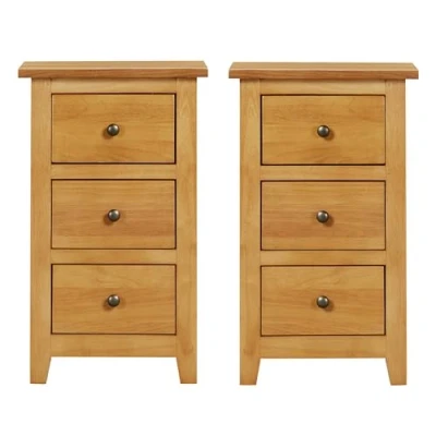 PREMIUM QUALITY CONSTRUCTION | Crafted with a real oak veneer top frame, rubberwood legs and solid wood drawer box, these light oak narrow bedside tables set of 2 measures W35cm x H58cm x D32cm. This oak furniture is perfect for small spaces. SLEEK & MODERN DESIGN | A smooth lacquered finish and brushed bronze metal knobs give these slim bedside cabinets a stylish edge. With its clean natural tones, it works beautifully as a narrow side table in both rustic and modern interiors. VERSATILE FUNCTIONALITY | Designed to save space, this slim bedside table is ideal for tight corners and smaller rooms. Use it as a nightstand or small bedside cabinet, it’s compact, functional, and stylish enough to suit a variety of home setup. SMART & SPACIOUS STORAGE | With dovetail-jointed drawers, this bedside cabinets set of 2 offers storage for keys, files, and everyday items. The small slim chest of drawers keeps your space neat, while the top surface is perfect for small décors. READY TO USE, EASY TO MAINTAIN | These narrow bedside tables set of 2 are ready to use right out of the box, no tools or setup needed. These slim bedside tables feature a lacquer finish that resists spills, dust, and daily wear for easy upkeep.