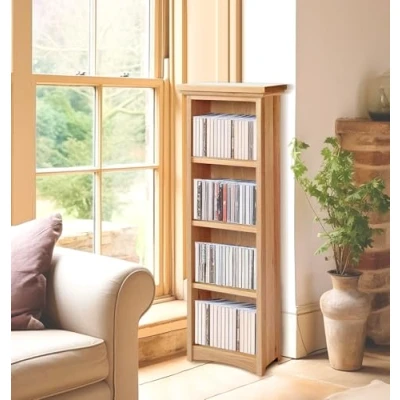 PREMIUM SOLID OAK WOOD | Crafted from a solid oak frame with an oak-veneered back panel, this 17.5D x 33W x 94.2H cm sized media storage cabinet offers strength and reliability. It’s the perfect choice for a CD shelving unit with timeless style. SLEEK & TIMELESS DESIGN | Designed with simplicity and style, this compact oak bookcase blends effortlessly into any room. Ideal CD storage unit or accent piece for bedrooms, lounges, and studies in traditional and modern interiors. AMPLE STORAGE | Fits 96CDs or 68DVDs, this unit is a multifunctional CD/DVD storage essential. Offering flexibility without taking too much space. Each shelf of this DVD stand holds up to 17 standard size DVD cases or 24 standard size jewel cd cases. SUPERIOR QUALITY COMMITMENT| This lacquered finished solid wood bookcase is designed for everyday use. This Hallowood oak furniture piece has a one-year quality guarantee offering peace of mind and long-term value. READY TO USE, EASY TO MAINTAIN | No assembly required, this DVD storage unit arrives ready to use. Whether as a small oak bookcase or media display, it's easy to clean. Just a quick wipe to keep it looking beautiful for years.