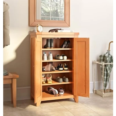 PREMIUM QUALITY SOLID OAK WOOD | Crafted from solid oak and oak veneer, the Cotswold Oak Wooden Cupboard combines strength and timeless design. Supported by elevated strong wooden legs, this shoe cabinet oak, at 40D x 65W x 102Hcm, is a durable piece. SLEEK & MODERN DESIGN | This tall shoe cabinet features antique-style handles and a medium oak finish that’s both elegant and modern. Perfectly matching other Hallowood oak furniture, it enhances hallways, bedrooms, or kitchen cabinets with ease. VERSATILE FUNCTIONALITY | Designed for more than footwear, this wooden shoe storage cabinet suits any room, hallway, living space, or utility area. Store 15 pairs of shoes or use them as an oak shoe storage cabinet for bags and outdoor gear. AMPLE STORAGE SPACE | Behind 2 doors, this shoe cupboard oak offers five wide shelves that store up to 15 shoes neatly. The top serves as a display surface, blending storage and décor, an elegant oak shoe rack perfect for any compact living space. READY TO USE, EASY TO MAINTAIN | Arrives fully assembled, this Hallowood Furniture shoe cabinet storage hallway needs no setup. The lacquered finish adds durability and makes it easy to clean, a smart solid wood shoe storage cabinet option.