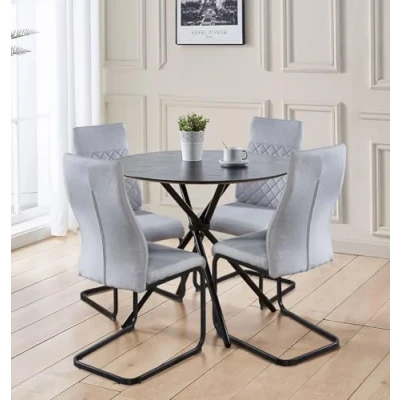 Hallowood Furniture Cullompton Black Dining Table and Chair Set 4, Wooden Effect Top Round Table, Small Kitchen Light Grey High Back Chairs with Metal Legs, Room Sets
