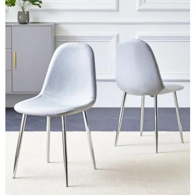 CUSHIONED FOR COMFORT & DURABILITY | Experience comfort with our upholstered dining chair in light grey fabric that resists dirt and spots. These dining chairs set of 2 have nickel plated metal legs for durability. It measures H86 x W45 x D54 cm. SLEEK & MODERN DESIGN | Transform your space with these dining room chairs that blend style and function effortlessly. Ideal for dining rooms, kitchens, offices, or cafés, this set of 2 dining chairs adds a contemporary touch to any setting. ELEVATE YOUR SEATING EXPERIENCE | Designed for ultimate comfort, these grey dining chairs set of 2 feature an ergonomically curved backrest and padded seat, offering excellent support for your waist and buttocks during meals or casual gatherings. SUPERIOR QUALITY COMMITMENT | Crafted from high-quality materials, these dining room chairs are built to last. Hallowood Furniture backs them with a one-year quality guarantee, built to last chairs for home or business use. EASY MAINTENANCE & ASSEMBLY | Simplify your setup with these kitchen chairs set of 2, featuring sturdy metal legs and an easy-to-follow instruction manual. Perfect for quick assembly, these 2 dining chairs is a practical choice for any space.