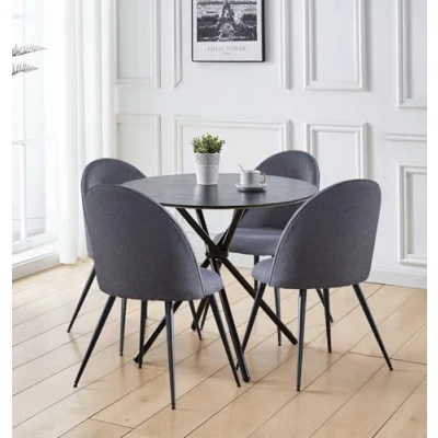 PREMIUM QUALITY CONSTRUCTION | Crafted for everyday use, this dining table and chairs set 4 includes wood effect MDF table top and measures W90xH75xD90cm. The table and chairs in curved-back grey fabric seats & black metal legs measure W53xH85xD49cm. SLEEK & MODERN DESIGN | Modern style shines with a striking round black dining table that commands attention in any space. Paired with comfy grey fabric chairs, this round table and chairs set 4 delivers elegance and function for everyday dining. VERSATILE FUNCTIONALITY | Plush seating and stylish design define this small dining table and chairs set 4, perfect for intimate gatherings. The matching dining table with 4 chairs offers a sleek wood-effect surface with metal legs for durability. SUPERIOR QUALITY COMMITMENT | Elevate your dining experience with a black dining table and chairs set 4 that blends comfort and durability. The space saving table and chairs boast solid build and a free 1 year quality guarantee. ASSEMBLY MADE EASY | Enjoy effortless dining with a compact round dining table with chairs included in this versatile table and chairs set 4. The sturdy black metal frame supports everyday use, and the easy assembly process makes setup a breeze.