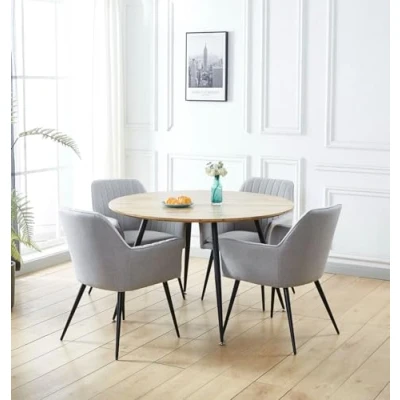 PREMIUM QUALITY CONSTRUCTION | Crafted from a premium MDF top round dining table, and 4 fabric chairs, both supported by metal legs, this set offers a long-lasting build. Dimensions are 120D x 120W x 75Hcm for table, and 62D x 60W x 83Hcm, chairs. SLEEK & MODERN DESIGN | This oak effect top kitchen table and chairs set 4 with armrests has an ergonomic design, in grey fabric cushion. With matching sturdy powder-coated black metal legs, this set offers a sleek industrial vibe for modern setup. VERSATILE FUNCTIONALITY | Designed for contemporary interiors, this round table and chairs set 4 is ideal for breakfast corners, apartments, offices, or cafes. Its multifunctional use makes it suitable for casual dining, or even cosy client meetings. SUPERIOR QUALITY COMMITMENT | This round kitchen table and chairs set 4 reflects Hallowood Furniture’s dedication to quality. This round dining table 120cm and chairs set 4 is made to meet the highest standards for safety and durability. ASSEMBLY MADE EASY | This laminated oak round dining table and chairs set 4 comes with high-quality easy to assemble metal legs. All packages include instructions manuals. A stylish, low-maintenance choice for any modern space.