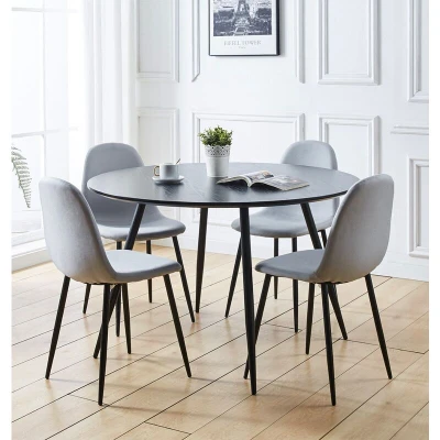 PREMIUM QUALITY CONSTRUCTION | Crafted with a wood effect MDF top and strong metal legs, this H75 x W120 x D120cm table and chairs set 4 at H86 x W45 x D54cm is built for durability. This round table and chairs are perfect for modern interiors. SLEEK & MODERN DESIGN | Featuring a black round dining table 120cm with a wood-effect finish and powder-coated metal legs, this dining room set blends sleek industrial design with plush grey fabric chairs for a modern, comfortable dining experience. VERSATILE FUNCTIONALITY | With its round kitchen table and grey chairs, this compact table and chairs set 4 offers multifunctional use across any space—ideal for cozy breakfasts, afternoon meetings, or evening meals in compact homes. SUPERIOR QUALITY COMMITMENT | Quality meets craftsmanship in a dining table and chairs set 4 made for everyday life. Backed by a one-year quality guarantee, this dining table set for 4 ensures peace of mind and elevates your home with durable, dependable style. ASSEMBLY MADE EASY | Enjoy a smooth setup with the round dining table and chairs set 4. It comes with clear instructions, and easy-fit metal legs for a quick assembly. A modern dining table and chairs set for everyday convenience.