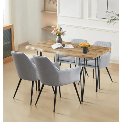 PREMIUM QUALITY CONSTRUCTION |This premium dining table and chairs set includes a 120W x 80D x 76H cm live edge effect table with steel legs and four upholstered steel grey chairs with arms (83H x 62D x 60W cm), built to last SLEEK & MODERN DESIGN | Crafted for style, the kitchen table and chairs set 4 combines natural textures with a refined modern finish. This kitchen table and chairs is designed to be both eye-catching and versatile, perfect for today’s interiors. VERSATILE FUNCTIONALITY | Perfect for modern living, the kitchen table set transitions easily from casual meals to formal occasions. This versatile dining room table and chairs with arm support are ideal for dining spaces or as home office furniture. SUPERIOR QUALITY COMMITMENT | Quality you can count on—crafted for daily use, this wooden dining table and chairs set is built with durable materials and smart design. A dependable dining table and armchair set backed by a free 1-year quality guarantee. ASSEMBLY MADE EASY | Putting together the dining table set for 4 is straightforward thanks to high-quality fittings and easy-to-follow guides. This wooden table and armchairs set is crafted for convenience, so you can enjoy it sooner.