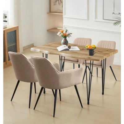 PREMIUM QUALITY CONSTRUCTION |This premium dining table and chairs set includes a 120W x 80D x 76H cm live edge effect table with steel legs and a set of 4 dining chairs with arms upholstered light brown (83H x 62D x 60W cm), built to last. SLEEK & MODERN DESIGN | Crafted for style, the kitchen table and chairs set 4 combines natural textures with a refined modern finish. This kitchen table and chairs is designed to be both eye-catching and versatile, perfect for today’s interiors. VERSATILE FUNCTIONALITY | Perfect for modern living, the kitchen table set transitions easily from casual meals to formal occasions. This versatile industrial dining table and chairs with arm support are ideal for dining spaces or as home office furniture. SUPERIOR QUALITY COMMITMENT | Quality you can count on—crafted for daily use, this wooden dining table and chairs set is built with durable materials and smart design. A dependable dining table and armchair set backed by a free 1-year quality guarantee. ASSEMBLY MADE EASY | Putting together the dining table set for 4 is straightforward thanks to high-quality fittings and easy-to-follow guides. This 4 seater table and armchairs set is crafted for convenience, so you can enjoy it sooner.