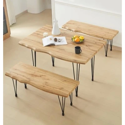 PREMIUM QUALITY CONSTRUCTION | This dining table and bench set (Table: H76×W120×D80 cm; Bench: H45×W110×D40 cm) combine a live edge top with metal-coated steel legs. This superior build makes the table and bench set remain resilient for years. SLEEK & MODERN DESIGN | With a natural live edge top and streamlined metal legs, the bench dining table set creates an effortlessly modern statement. The dining table and bench set add sleek elegance to kitchens, dining rooms, or offices. VERSATILE FUNCTIONALITY | With practical appeal, the table and bench set work beautifully as dining furniture, study space, or display surface. Together, the dining table with benches provide versatile functionality for any room or occasion. SUPERIOR QUALITY COMMITMENT | Quality you can count on, crafted for daily use, this bench dining table set is built with durable materials and smart design. A dependable kitchen bench table set backed by a free one-year quality guarantee. ASSEMBLY MADE EASY | Thoughtfully designed, the dining table with benches include all bolts and instructions for swift construction. The dining table bench set guarantees easy assembly and immediate use.