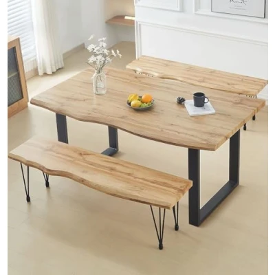 PREMIUM QUALITY CONSTRUCTION | This dining table set (table: H77.5×W160×D90 cm; bench: H45×W150×D40 cm) combines a live edge top with U-shaped metal legs. This superior build of the dining table with bench makes this set remain resilient for years. SLEEK & MODERN DESIGN | With a natural live edge top and streamlined metal legs, the bench dining table set creates an effortlessly modern statement. The wooden table and bench set add sleek elegance to kitchens, dining rooms, or offices. VERSATILE FUNCTIONALITY | With practical appeal, the table and bench set work beautifully as dining furniture, study space, or display surface. Together, the dining table with benches provide versatile functionality for any room or occasion. SUPERIOR QUALITY COMMITMENT | Quality you can count on, crafted for daily use, this bench table set is built with durable materials and smart design. A dependable kitchen bench table set backed by a free one-year quality guarantee. ASSEMBLY MADE EASY | Thoughtfully designed, the dining table with benches include all bolts and instructions for swift construction. The wooden dining table bench set guarantees easy assembly and immediate use.