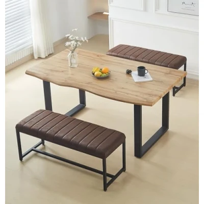 PREMIUM QUALITY CONSTRUCTION | This bench style dining table set (Table: H77.5×W160×D90cm; Benches: H45×W110×D40cm) combines a live edge top with metal legs. This superior build makes this 2 corner bench with table set remain resilient for years. SLEEK & MODERN DESIGN | Crafted to impress, this live edge dining table brings organic charm and modern structure together. The coordinated table and bench set features wood grain and clean lines, ideal for any contemporary dining or office space. VERSATILE FUNCTIONALITY | Designed for modern living, the dining table with bench offers more than just a spot to eat. This dining bench set of 2 doubles as a workspace, display table, or study area—perfect for adapting to your daily needs in style. SUPERIOR QUALITY COMMITMENT | Built for real homes, the rustic dining table and bench set offers lasting durability in a timeless design. The table bench set is backed by a 1-year quality guarantee that goes beyond first impressions. ASSEMBLY MADE EASY | Spend less time building and more time enjoying this bench dining table set. With all bolts, hardware, and clear instructions, the corner dining table set with bench indoor guarantees easy, reliable assembly for any room.
