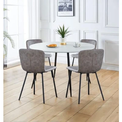 PREMIUM QUALITY CONSTRUCTION | Crafted with a marble effect top and strong metal legs, this faux marble white round table at H75 x W120 x D120cm is set with 4 chairs in H76.5 x W51 x D44cm. These dining set for 4 are built for durability and comfort. SLEEK & MODERN DESIGN | Featuring a contemporary round design, this marble effect kitchen table and chairs set 4 cushioned in faux taupe leather has matching powder-coated black metal legs that offers a sleek industrial vibe for modern setup. VERSATILE FUNCTIONALITY | This round dining table with chairs adapts easily to any space, from kitchens to work areas. The kitchen table and chairs set 4 combine style and function for versatile everyday living. SUPERIOR QUALITY COMMITMENT | Backed by a one-year quality guarantee, this round dining table and chairs set 4 reflects Hallowood Furniture’s dedication to quality. Every piece is made to meet the highest standards for safety and durability. ASSEMBLY MADE EASY | This round marble dining table and 4 chairs comes with high-quality easy to assemble metal legs. All packages include instructions manuals. A stylish, low-maintenance home and kitchen furniture choice for any modern space.