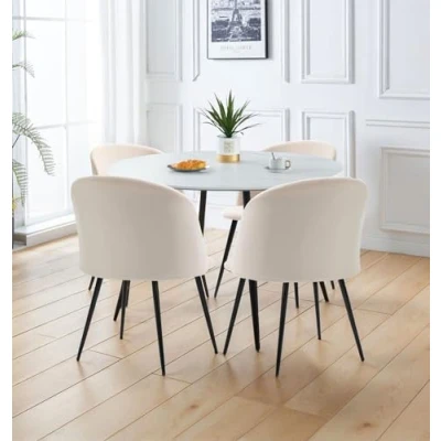 PREMIUM QUALITY CONSTRUCTION | This table and chairs set 4 features a laminated white marble effect top and strong metal legs. At H75 x W120 x D120cm table, and H76 x W54 x D52cm chairs, this dining table set for 4 is built for lasting durability. SLEEK & MODERN DESIGN | This round dining table and 4 chairs feature smooth lines and modern materials. With a laminated marble-effect top, black metal frame, and beige fabric chairs, this dining table set for 4 creates a sophisticated dining area. VERSATILE FUNCTIONALITY | Whether used at home or in stylish office break rooms, this round table and chairs set 4 fits right in. The round dining table with chairs offer a space-saving yet elegant solution for modern lifestyles. SUPERIOR QUALITY COMMITMENT | Backed by a one-year quality guarantee, the Cullompton round dining table and chairs set 4 reflects Hallowood’s dedication to quality. Every piece is made to meet the highest standards for safety and durability. ASSEMBLY MADE EASY | Assembly of the white dining table and chairs set of 4 is simple and hassle-free, with the included clear instructions manual. With minimal effort, the round dining table set can be built quickly and securely.