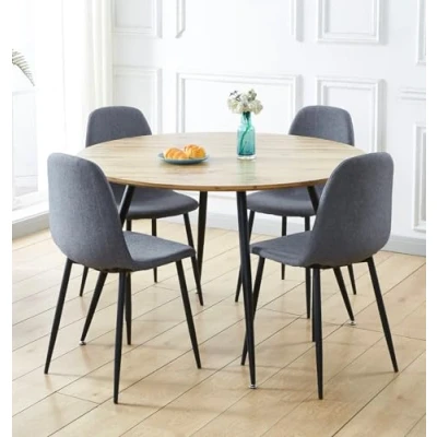 PREMIUM QUALITY CONSTRUCTION | Crafted from a premium MDF top round dining table, and 4 fabric chairs, both supported by metal legs, this set offers a long-lasting build. Dimensions are 120D x 120W x 75Hcm for table, and 54D x 45W x 86Hcm for chairs. SLEEK & MODERN DESIGN | This light oak effect top kitchen table and chairs set 4 has an ergonomic design, in grey fabric cushion. With matching sturdy powder-coated black metal legs, this stylish set offers a sleek industrial vibe for modern setup. VERSATILE FUNCTIONALITY | Designed for contemporary interiors, this round table and chairs set 4 is ideal for breakfast corners, apartments, offices, or cafes. Its multifunctional use makes it suitable for casual dining, or even cosy client meetings. SUPERIOR QUALITY COMMITMENT | Backed by a one-year quality guarantee, this round dining table and chairs set 4 reflects Hallowood Furniture’s dedication to quality. Every piece is made to meet the highest standards for safety and durability. ASSEMBLY MADE EASY | This laminated light oak dining table and chairs set 4 comes with high-quality easy to assemble metal legs. All packages include instructions manuals. A stylish, low-maintenance choice for any modern space.
