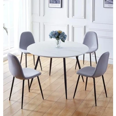 ManoManoGeneral description This stylish dining set features a large round table with a white marble effect top and four grey fabric chairs. The table, with a diameter of 120cm, comfortably accommodates four adults, making it perfect for both home and café settings. Its laminated board construction ensures durability, while the powder-coated metal legs provide a modern touch that complements any décor. Technical specifications Table diameter: 120cm Table height: 75cm Material: Metal and MDF Finish: Powder Coated Chair color: Light Grey Installation Assembly required: Legs need fixing Usage Ideal for dining, home office, or casual seating Versatile design suitable for various interior styles
