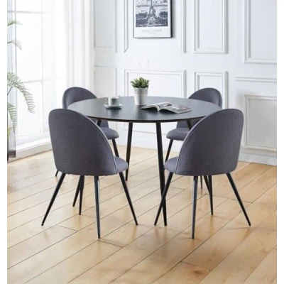 PREMIUM QUALITY CONSTRUCTION | Crafted with a wood effect MDF board top black table and chairs with black metal legs. Built for durability, this round table and chairs set 4 measures H75 x W120 x D120cm for table, and H85 x W53 x D49cm for chairs. SLEEK & MODERN DESIGN | Give your dining area a modern update with this dining table and chairs set 4. The sleek Hallowood Furniture round black table with dark grey seats offers practical comfort for everyday meals or special occasions. VERSATILE FUNCTIONALITY | Perfect for small spaces, the round black kitchen table with 4 chairs in dark grey fabric offers supportive seating and flexible use. This round table and chairs set adapts effortlessly for dining, working, or coffee chats. SUPERIOR QUALITY COMMITMENT | Made for everyday use, the round dining table and chairs set 4 grey features a durable and sleek design. A high-quality table and chairs set 4 supported by a 1-year quality guarantee for peace of mind. ASSEMBLY MADE EASY | Set up your space in minutes with a round dining table and chairs that’s easy to build as it is to enjoy. The kitchen table and chairs set 4 includes clear instructions, and hardware for a fast, stress-free leg-assembly.