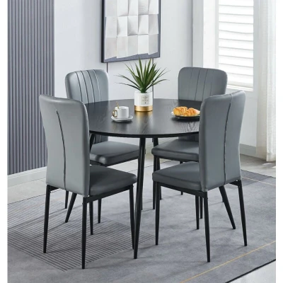 PREMIUM QUALITY CONSTRUCTION | Crafted in laminated MDF tabletop and powder coated legs, this kitchen table and chairs set 4 measures H75xW120xD120cm (Table) and H96xW42xD56cm (Chairs). A black table and chairs in a light grey seat made for durability. SLEEK & MODERN DESIGN | Elevate your dining room instantly with a round dining table in black MDF and powder-coated metal legs. It’s the centrepiece of a 4 seater dining table and chairs set with soft grey faux leather chairs. VERSATILE FUNCTIONALITY | Designed for comfort, the dining chairs set of 4 boasts light grey faux leather upholstery and solid frames. With a round dining table, this dining table and chairs set adapts effortlessly for dining, working, or relaxing. SUPERIOR QUALITY COMMITMENT | Every meal feels special with a black round dining room table and chairs set offering lasting strength. This table and chairs set 4 is built to withstand daily use backed with a 1-year quality guarantee. ASSEMBLY MADE EASY | Simplify setup with a round dining table and chairs set 4 that’s built for convenience. Ideal for modern dining room sets, the wooden table and chairs come with easy-to-follow instructions, and all the tools you need.