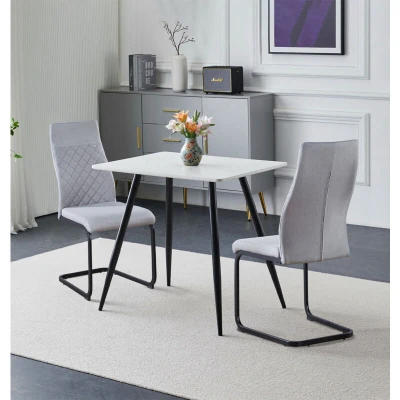 PREMIUM QUALITY CONSTRUCTION | Crafted from a premium MDF top rectangular small dining table, and 2 fabric chairs, both supported by metal legs, this set offers a long-lasting build. Dimensions: 60D x 80W x 75Hcm table, and 99H x 44W x 60Dcm chairs. SLEEK & MODERN DESIGN | This white marble effect top 2 seater table and chairs in cantilever high back design and grey fabric upholstery, has matching powder-coated black metal legs. This stylish set offers a sleek industrial vibe for modern setup. VERSATILE FUNCTIONALITY | Designed for small spaces, this small dining table and chairs set 2 is ideal for breakfast corners, apartments, offices, or cafes. Its multifunctional use makes it suitable for casual dining, or even cosy client meetings. SUPERIOR QUALITY COMMITMENT | Backed by a one-year quality guarantee, this 2 seater dining table and chairs reflects Hallowood Furniture’s dedication to quality. Every piece is made to meet the highest standards for safety and durability. ASSEMBLY MADE EASY | This small 2 seat dining table and chairs come with high-quality easy to assemble black metal legs. All packages include instructions manuals. This dining table set is a stylish, low-maintenance choice for any modern space.