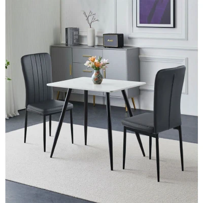 PREMIUM QUALITY CONSTRUCTION | Crafted from a premium MDF top laminated marble dining table, and 2 chairs, both supported by metal legs, this set offers a long-lasting build. Dimensions: H75 x W80 x D60cm (table), and 56D x 42W x 96Hcm (chairs). SLEEK & MODERN DESIGN | This white marble effect top small kitchen table and chairs set 2 has an ergonomic design, in faux leather black cushion. With matching powder-coated metal legs, this dining set for 2 brings industrial vibe for a modern setup. VERSATILE FUNCTIONALITY | Designed for versatility, this faux marble white small table and chairs is ideal for breakfast corners, apartments, offices, or cafes. Its multifunctional use makes it suitable for casual dining, or cosy client meetings. STURDY AND COMFORTABLE | This small dining table and 2 chairs reflects Hallowood Furniture’s dedication to quality. This Cullompton set offers supportive comfort and a sleek, modern look, perfect for dining, lounging, or working in any room. ASSEMBLY MADE EASY | This small table and chairs for 2 comes with high-quality easy to assemble metal legs. All packages include instructions manuals. A stylish, low-maintenance choice for any modern space.
