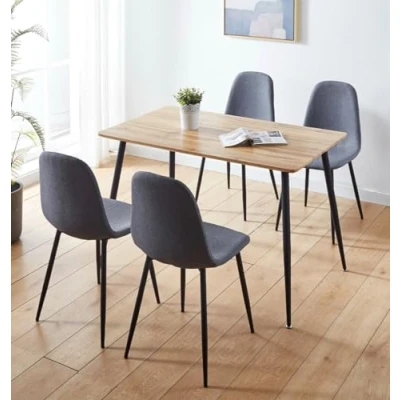 ManoManoGeneral description This impressive Cullompton Small Dining Table and Chairs Set is designed to catch the eye with its stunning oak effect table-top and sturdy black powder-coated legs. The table is sized at 120 x 70 cm, making it a perfect fit for homes of all sizes without being overbearing. It serves various purposes around the home and looks great in any setting. The set includes four contemporary grey fabric dining chairs that complement the table beautifully. Technical specifications Table dimensions: 120 cm (length) x 70 cm (width) x 75 cm (height) Material: Metal and MDF Finish: Powder Coated Chair color: Grey Installation Assembly required: Legs need fixing Usage Designed for 4 adults, can accommodate up to 6 people when mixed with young children Ideal for dining, home office, or casual seating