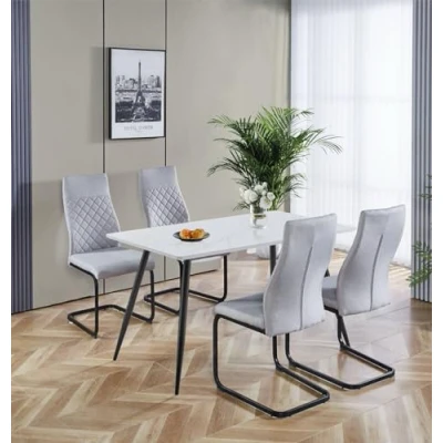 PREMIUM QUALITY CONSTRUCTION | Crafted from a premium MDF top rectangular dining table, and 4 fabric chairs, both supported by metal legs, this set offers a long-lasting build. Dimensions: 70D x 120W x 75Hcm (table), and 99H x 44W x 60D cm (chairs). SLEEK & MODERN DESIGN | This white marble effect top kitchen table and chairs set 4 in cantilever high back design and grey fabric upholstery, has matching powder-coated black metal legs. This stylish set offers a sleek industrial vibe for modern setup. VERSATILE FUNCTIONALITY | Designed for small spaces, this small dining table and chairs set 4 is ideal for breakfast corners, apartments, offices, or cafes. Its multifunctional use makes it suitable for casual dining, or even cosy client meetings. SUPERIOR QUALITY COMMITMENT | Backed by a one-year quality guarantee, this rectangular dining set for 4 reflects Hallowood Furniture’s dedication to quality. Every piece is made to meet the highest standards for safety and durability. ASSEMBLY MADE EASY | These rectangular table & chair sets come with high-quality easy to assemble black metal legs. All packages include instructions manuals. This dining table set is a stylish, low-maintenance choice for any modern space.