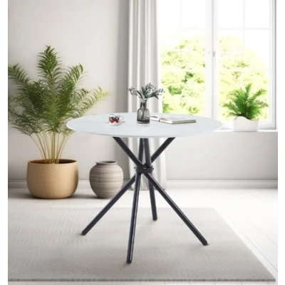 ManoManoGeneral description This stylish dining table features a white marble effect top and sturdy black powder-coated metal legs, making it a striking addition to any dining room or kitchen. Its round shape allows it to fit seamlessly into rooms of any size, offering versatility and aesthetic appeal. Technical specifications Height: 75 cm Width: 90 cm Length: 90 cm Material: Metal and MDF Finish: Powder Coated Colour: White Compatibility and accessories Can be paired with matching Grey Fabric Chair featuring the same black powder-coated legs. Installation Assembly required: Legs need fixing. Usage Ideal for dining rooms and kitchens. Versatile for various uses in the home.