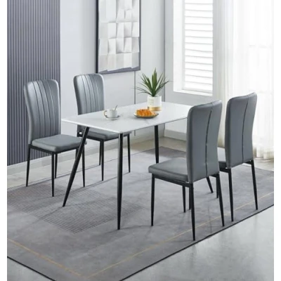PREMIUM QUALITY CONSTRUCTION | This laminated faux marble top dining table and chairs set 4 in grey faux leather, both supported by metal legs, offers a long-lasting build. Measures H75 x W120 x D70cm (Table) and H96 x W42 x D56cm (Chairs). SLEEK & MODERN DESIGN | Refined yet practical, this 4 seater dining table and chairs set showcases a marble-effect dining table with slim metal legs, paired with padded grey faux leather chairs, ideal for adding modern flair to everyday meals. VERSATILE FUNCTIONALITY | Create a flexible space with this dining chairs set of 4. The padded faux leather dining chairs blend comfort and modern style, making them perfect for everyday meals, remote work setups, or social spaces SUPERIOR QUALITY COMMITMENT | Rely on a dining table set designed to go the distance. Hallowood Furniture’s table and chairs set 4 is backed by a one-year quality guarantee, offering lasting durability and day-to-day reliability. ASSEMBLY MADE EASY | Experience hassle-free setup with a 4 chair dining table set designed for modern living. Featuring detailed instructions, the table and 4 chairs dining set combines easy assembly with stylish, low-maintenance elegance.