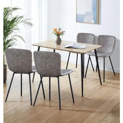 ManoManoGeneral description This rectangular dining table, adorned with an oak-effect top and sleek powder-coated legs, effortlessly commands attention wherever it graces a home. Crafted with a sturdy laminated board, the table's oak finish captivates while providing a versatile centerpiece that suits rooms of various sizes. Its adaptable design offers myriad possibilities for utilization, allowing you to maximize its appeal and functionality in your space. Complementing this stylish table are the matching grey faux leather chairs, featuring the same sleek black powder-coated legs. These chairs boast a modern leather effect fabric that effortlessly blends into any decor. Their neutral yet inviting tones and distinctive ergonomic design prioritize comfort while emanating contemporary elegance, ensuring they seamlessly fit in the kitchen, dining room, lounge, or hallway. Versatile and visually striking, whether used as dining chairs or office seating, these pieces elevate any setting, promising